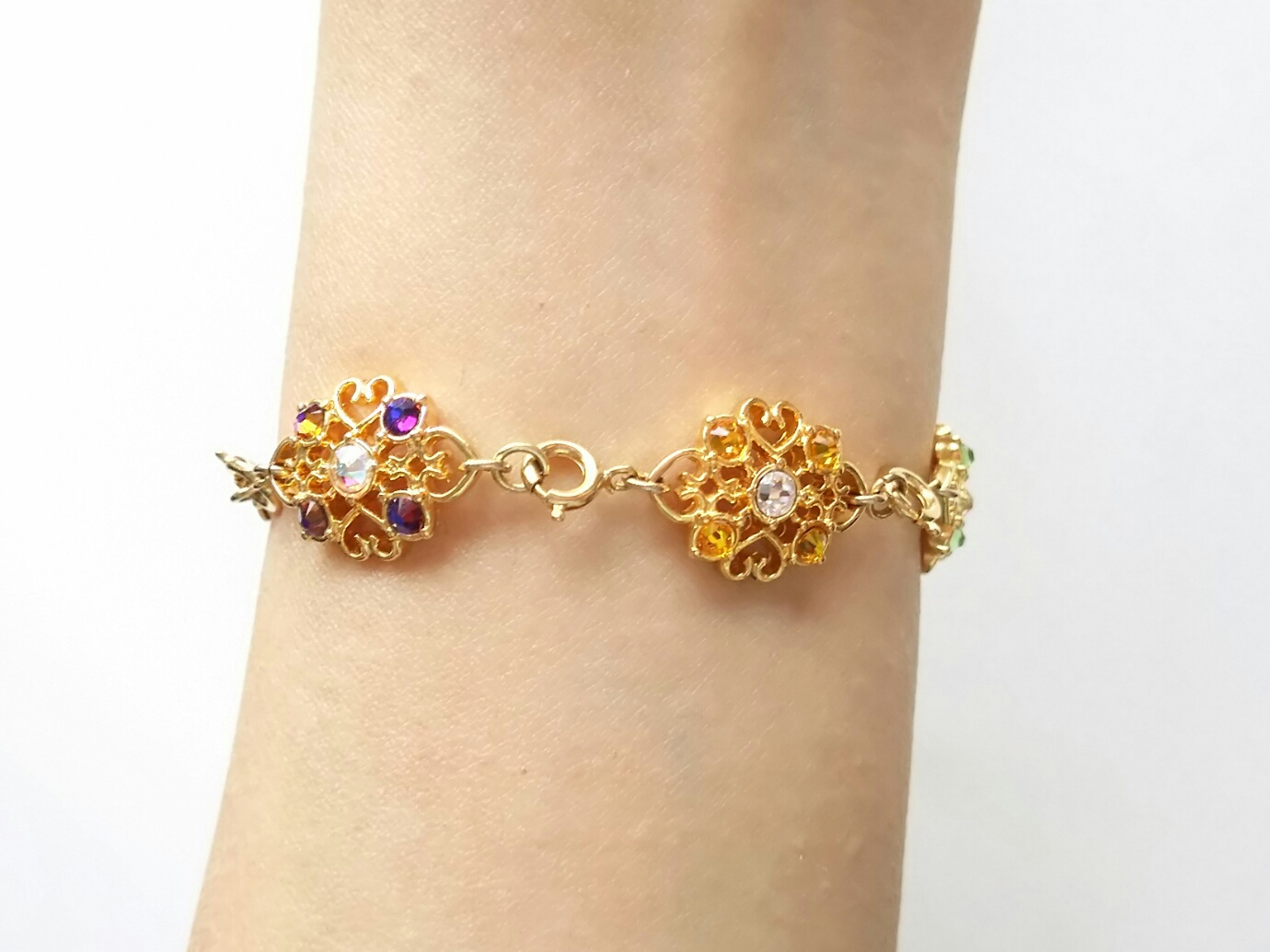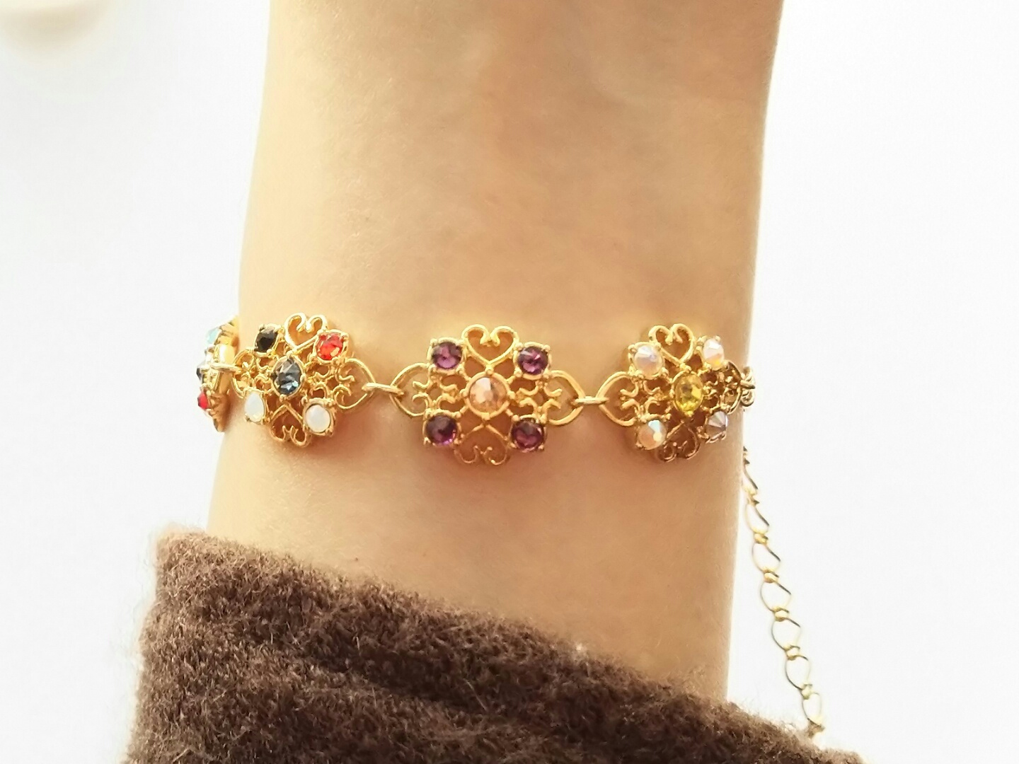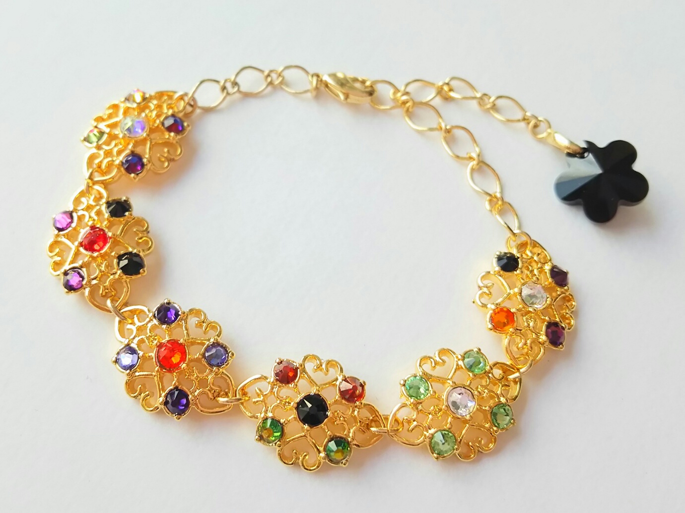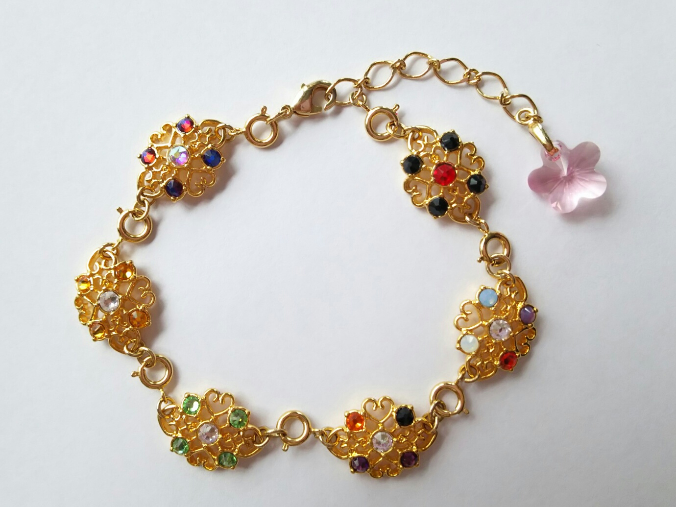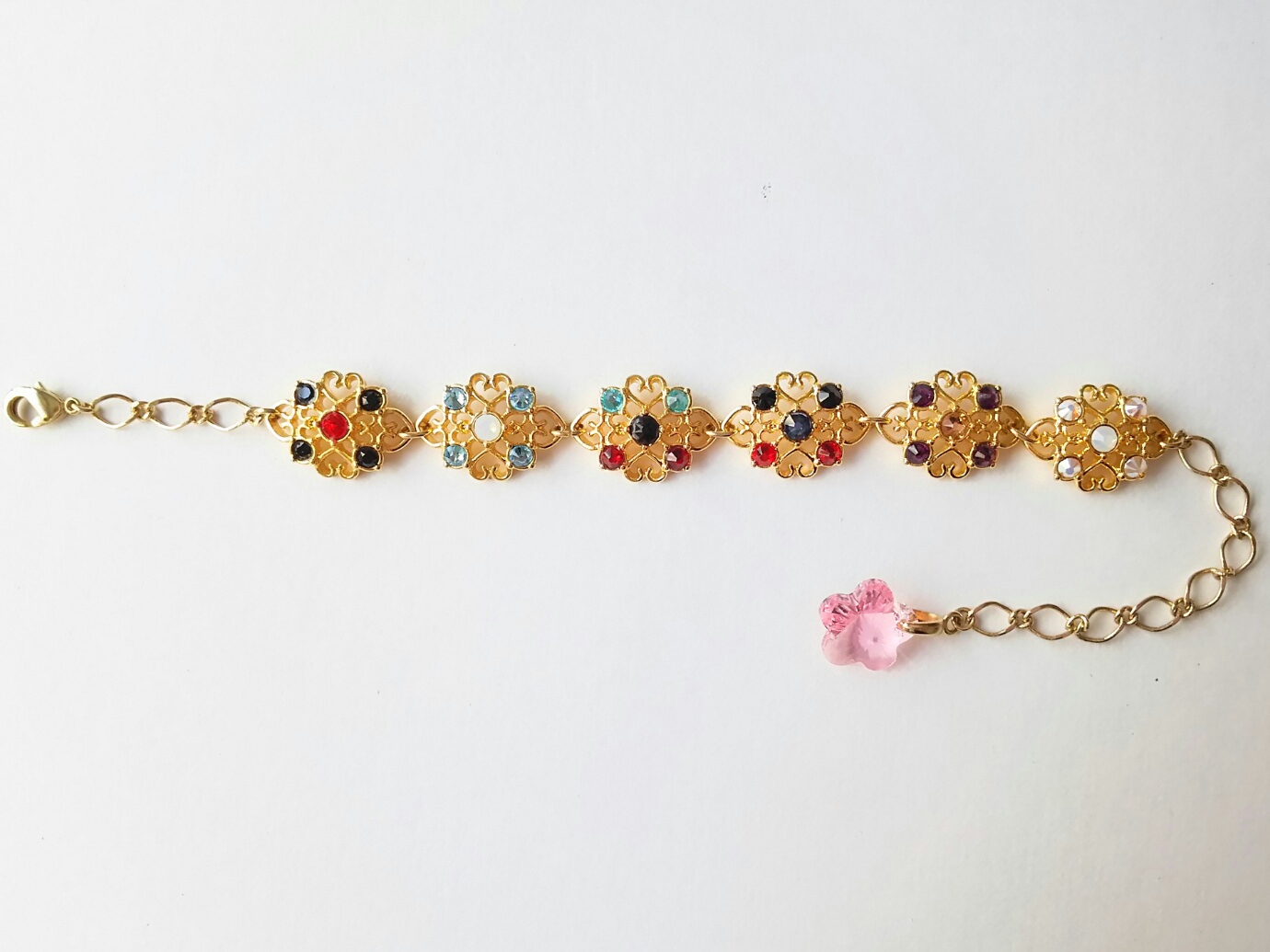 ペアブレスレットや6人ブレスレットはチェーンの長さが違うので、チェーンはそれぞれ別のものになります、チェーンの端に付いている桜のようなお花のスワロフスキーのカラーもそれぞれ違います。