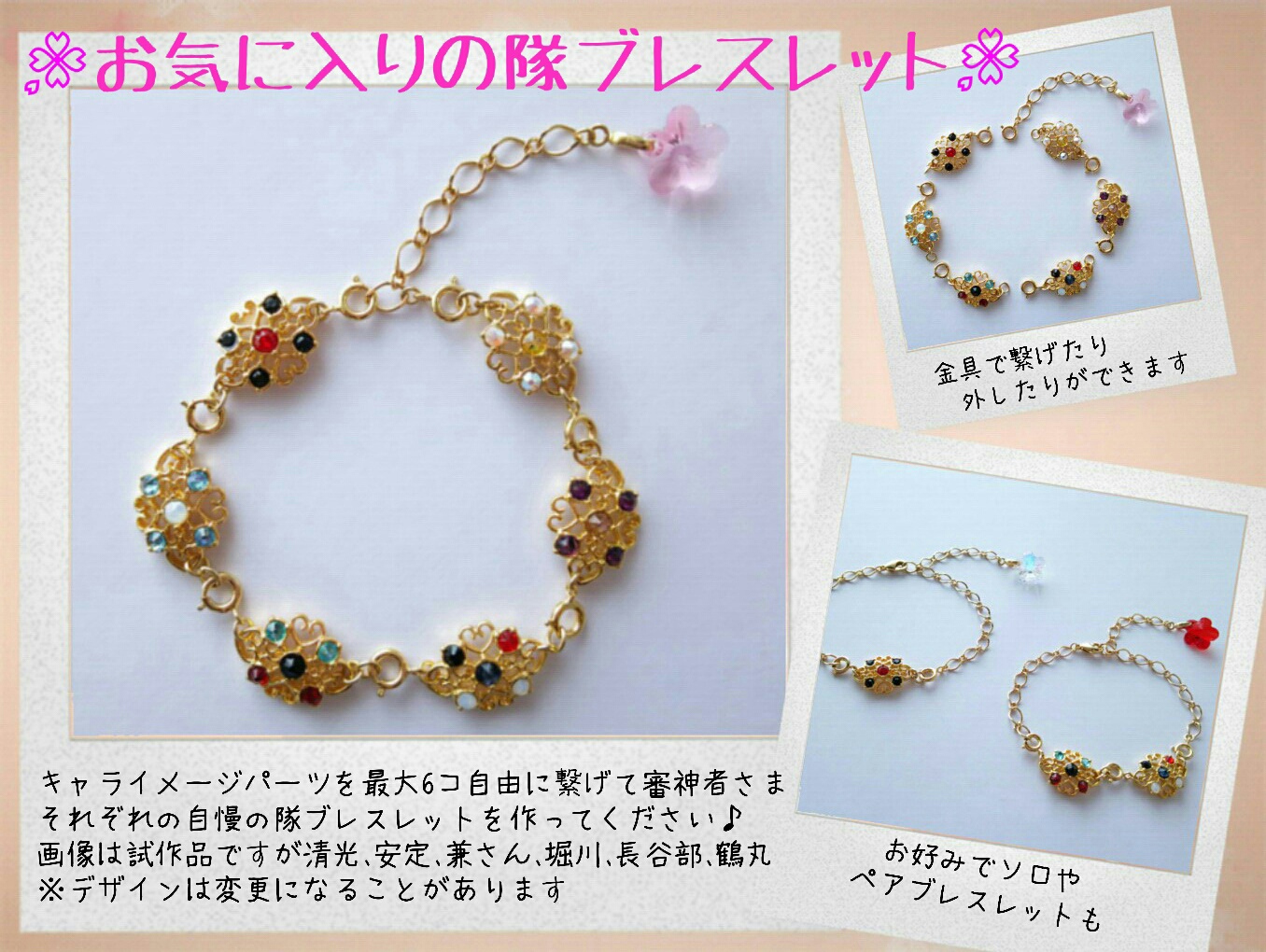 このブレスレットを考えた最初はキャラパーツにお守りや刀装や馬や桜吹雪に見立てたビーズなどをつけることも考えていたのですが、値段が高くなってしまうのでやめました。