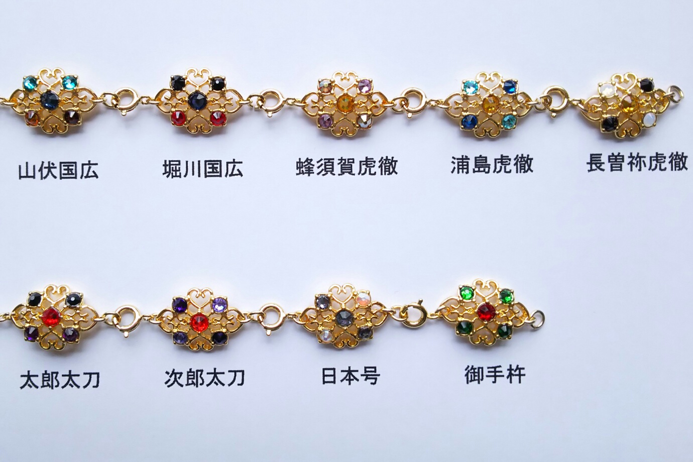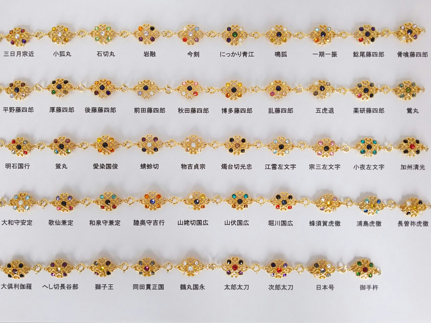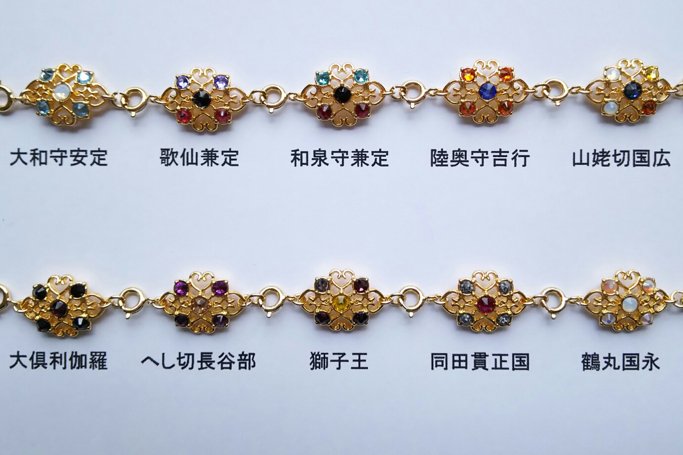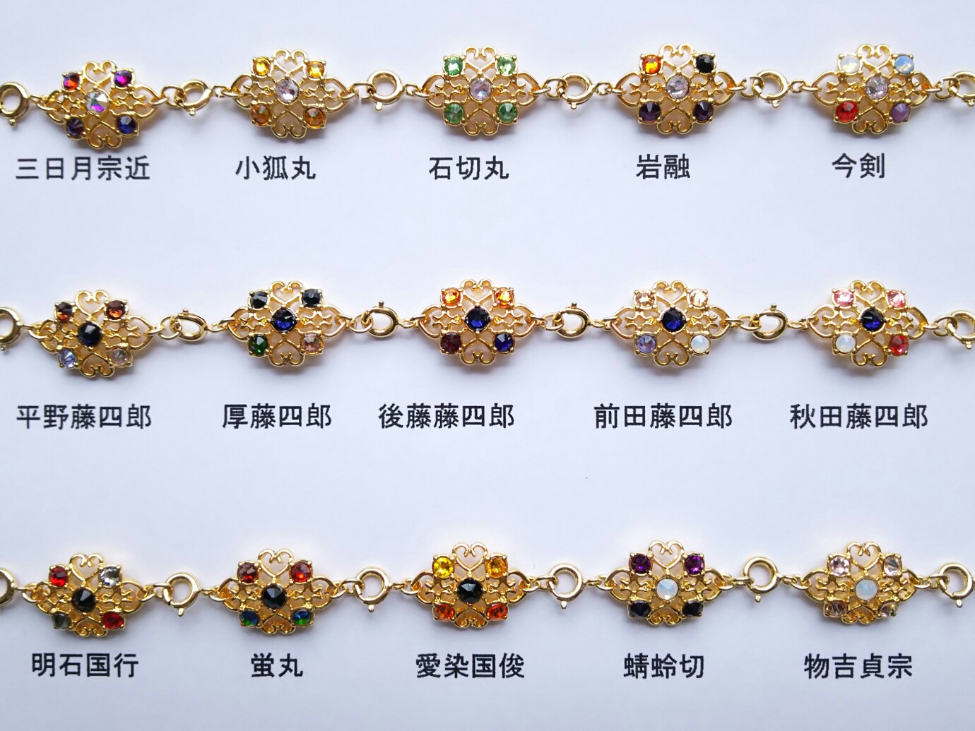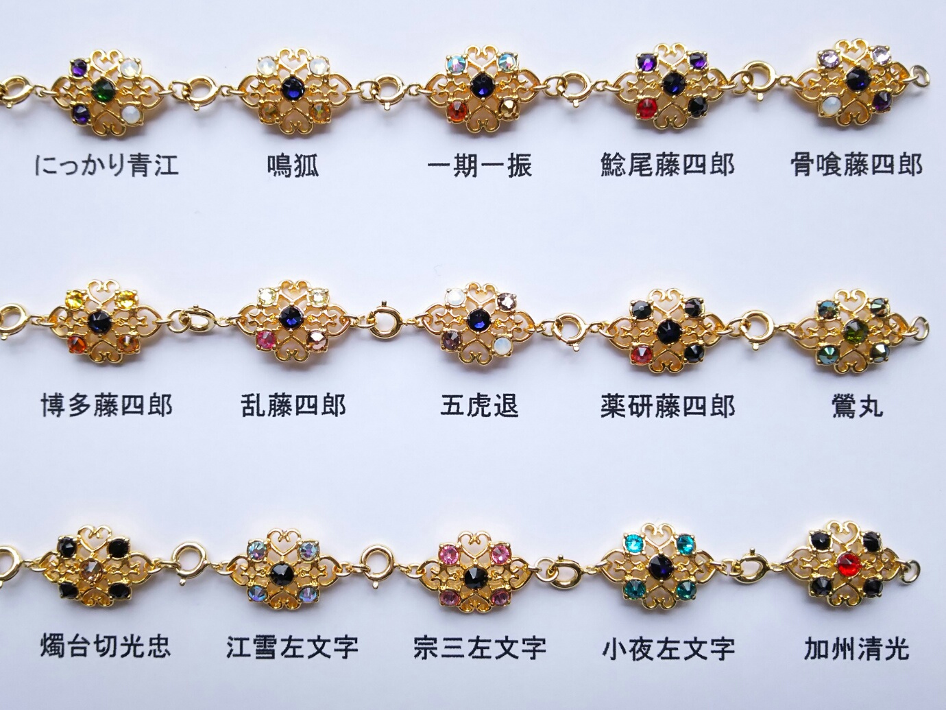 固定のキャラと順番でブレスレットを作る場合、名前を書いてくれた順に繋げて作ります。『清光、安定、兼さん、堀川、長谷部、鶴丸』って書いてあったらこんな風になります。